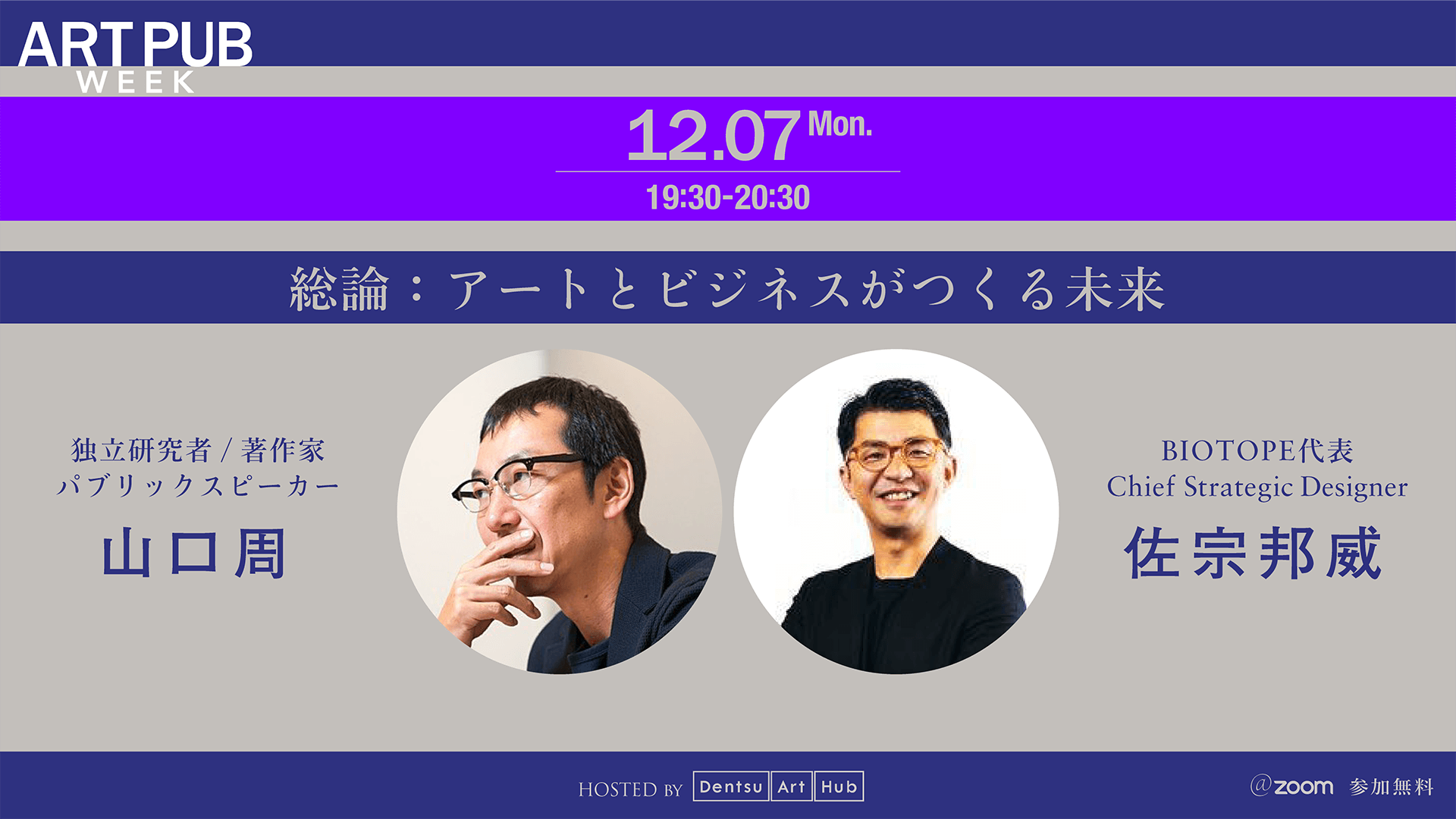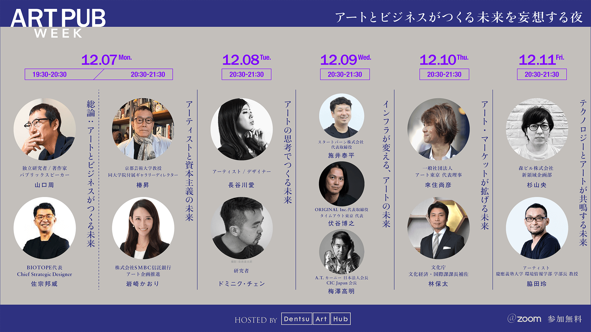「ART PUB NIGHT / ART PUB WEEK」は、そんなゲストをお呼びしてちょっとゆるめの空気の中でアートとビジネスがつくる未来に向けて妄想を膨らませる、オンライントークイベント。