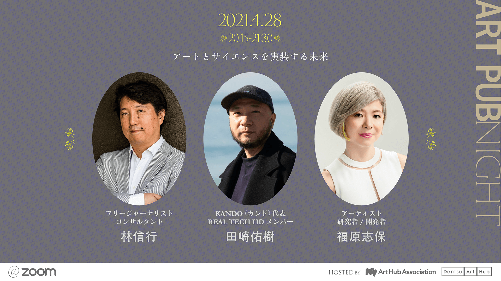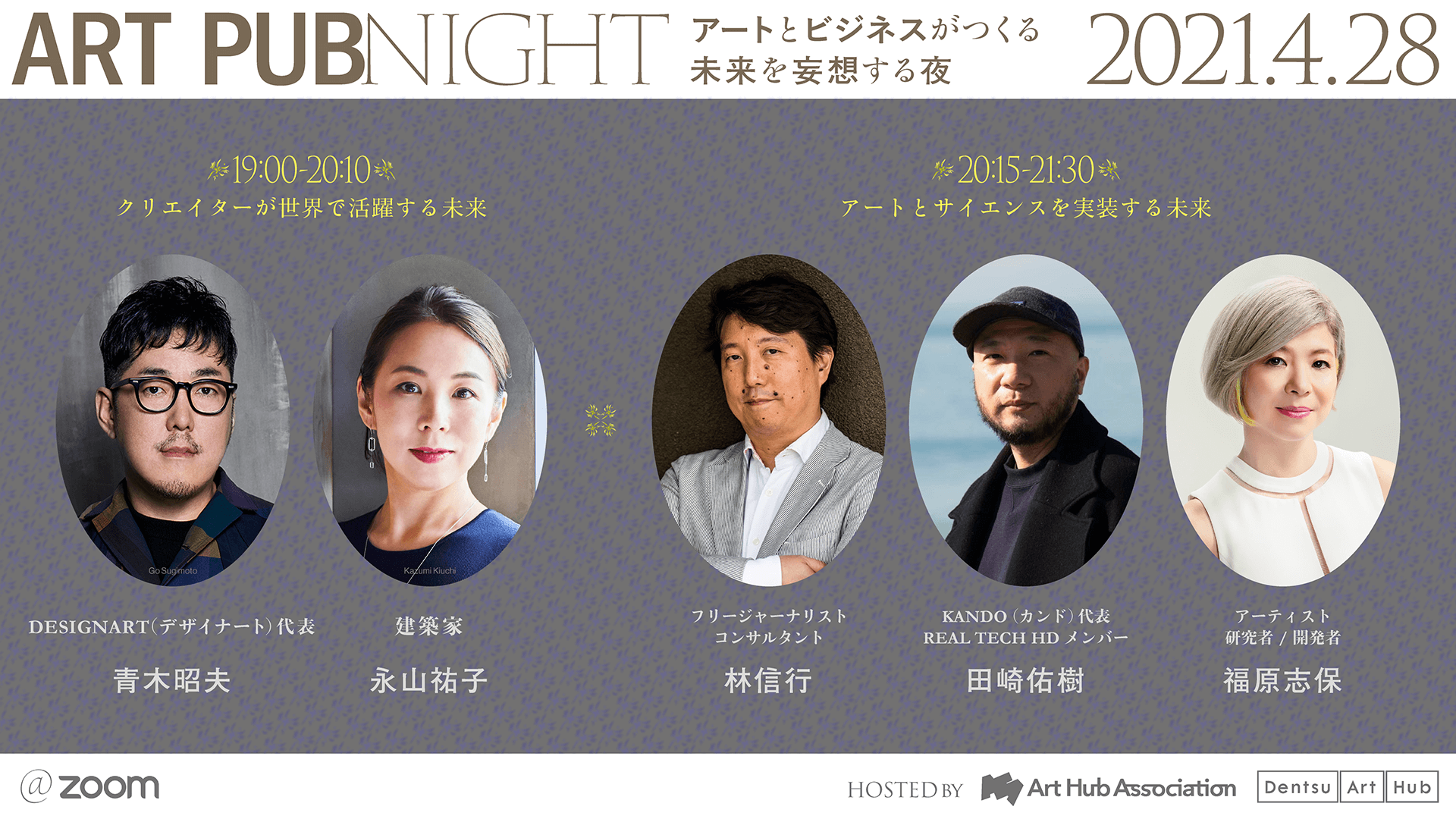 第1回目となるART PUB NIGHTを2021年4月28日に実施。 「クリエイターが世界で活躍する未来」と「アートとサイエンスを実装する未来」というテーマで5人のゲストが登壇した。